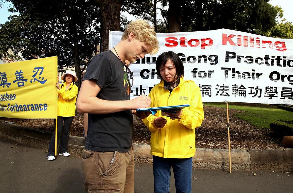 Kada je jedan mladi čovjek pročitao letak koji je dva dana prije dobio u centru Sidneja, bio je potresen sljedećom informacijom: Zatvorenici savjesti, koji su većinom praktikanti Falun Gonga, u zatvorima ubijaju u organizaciji kineskog komunističkog režima zbog uzimanja njihovih organa za potrebe transplantacije. On je, kao i drugi građani Sidneja toga dana, bio šokiran spoznajom da postoje takve okrutnosti, usmjerene protiv nevinih građana koji samo prakticiraju miroljubivo spiritualno vjerovanje.