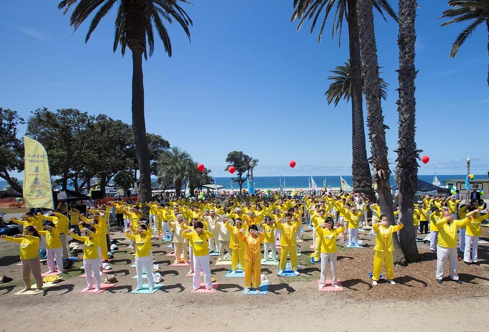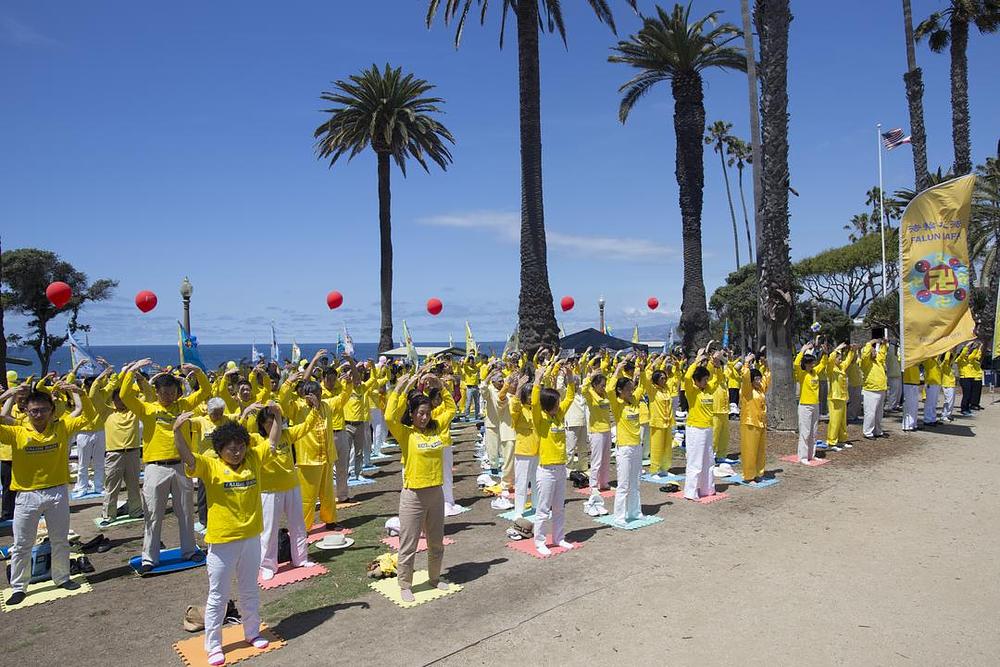 Nekoliko stotina praktikanata Falun Dafa iz Los Angelesa je 8. maja 2016. godine proslavilo 17. godišnjicu Svjetskog Falun Dafa dana na pristaništu u Santa Monici.