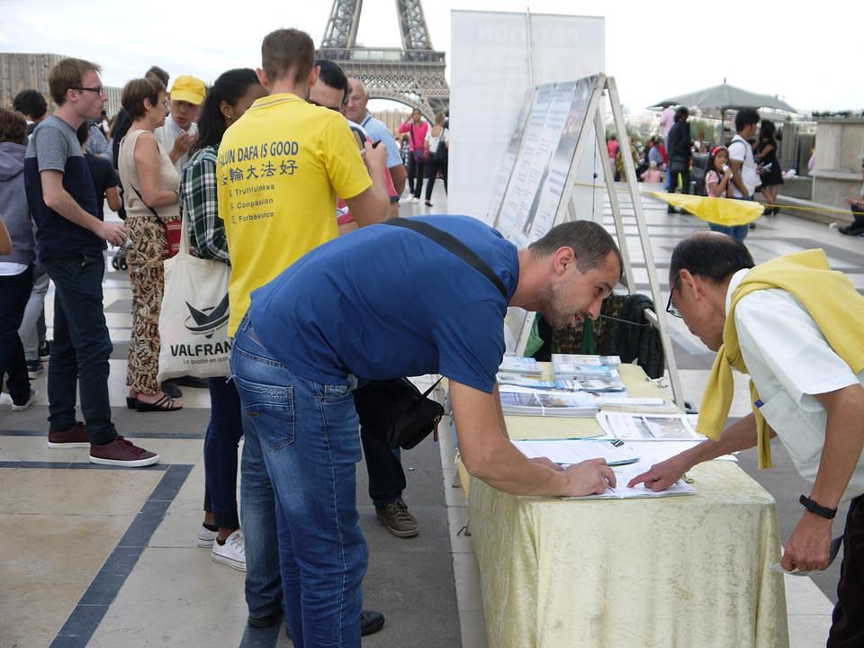 Ajfelov toranj je još jedno čuveno turističko mjesto na kojem praktikanti predstavljaju Falun Gong i razotkrivaju progon.