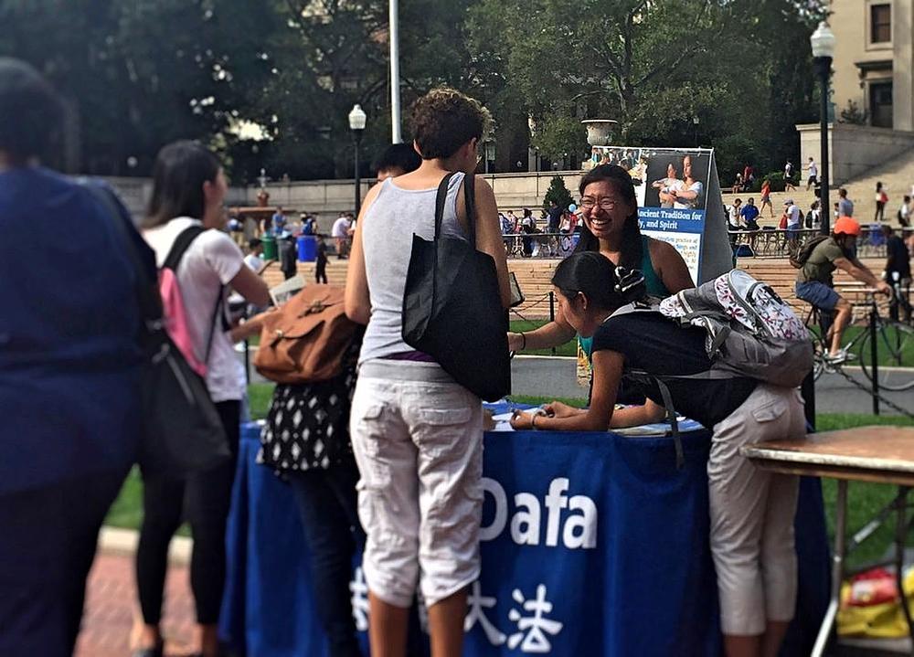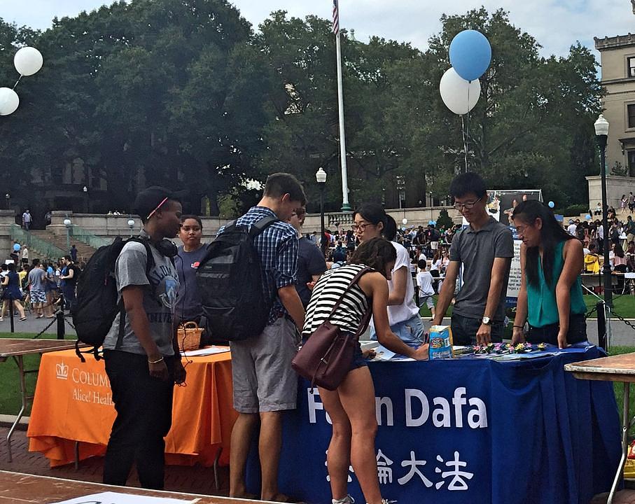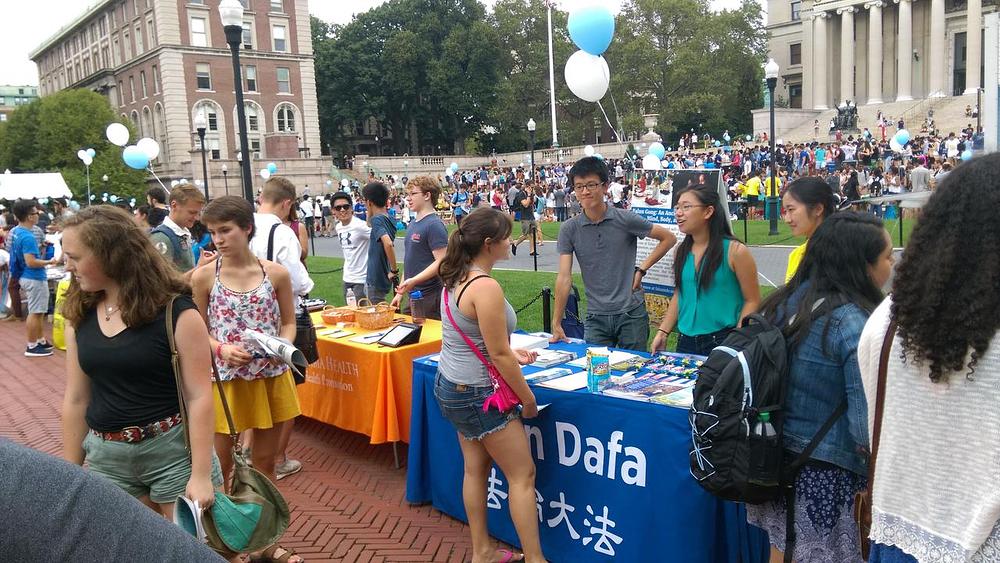 Na Kolumbija Univerzitetu, 300 studentskih organizacija je postavilo svoje štandove od Low Plaza do Butler Library, 9. septembra. Praktikanti su tu davali informacije o svojim besplatnim radionicama, što je zainteresovalo mnoge studente. Nekoliko je kineskih studenata bilo veoma srećno što su u kampusu naišli na Falun Gong i što su saznali šta je stvarno Falun Gong.