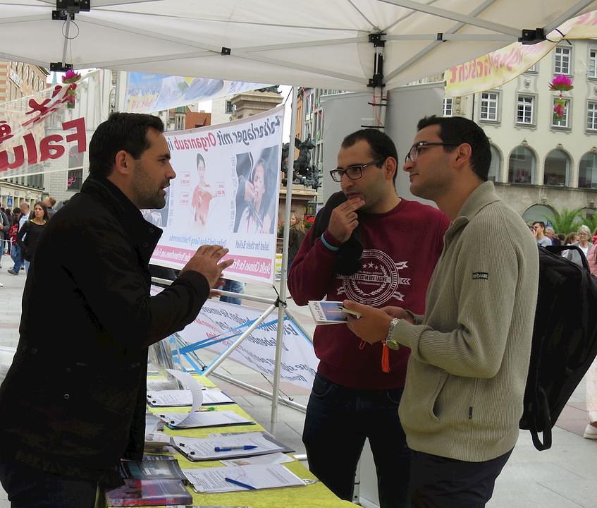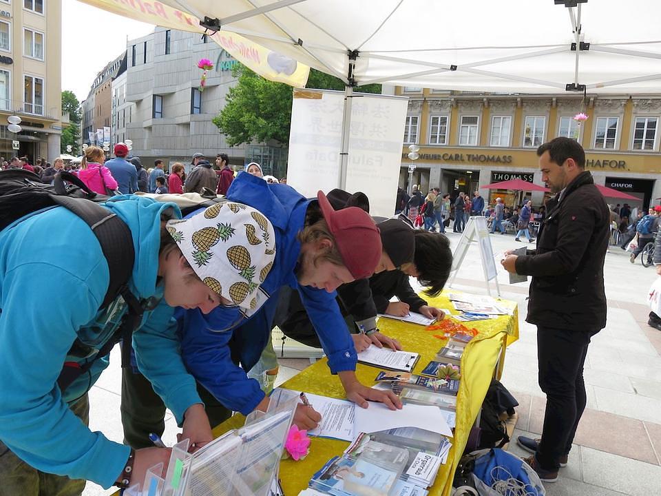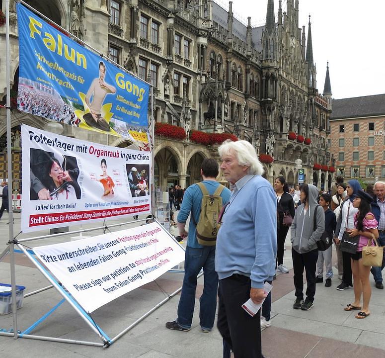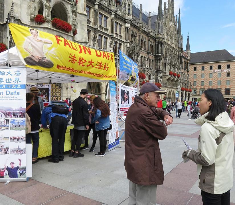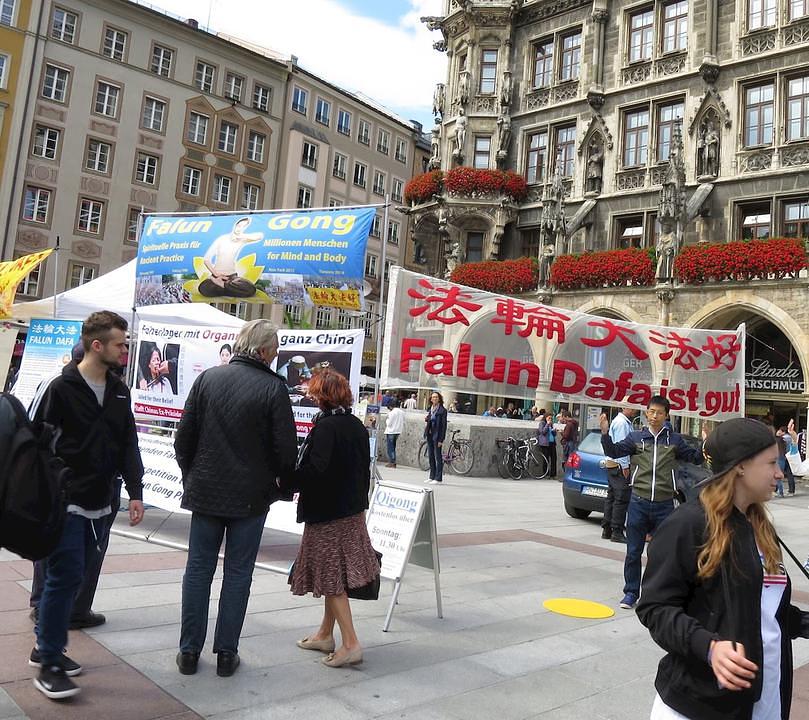 Praktikanti Falun Gonga su se okupili 12. avgusta na Marienplatzu u centru Minhena kako bi informisali javnost o progonu ove meditacijske prakse koji traje u Kini. Uz demonstraciju izvođenja blagih Falun Gong vježbi, praktikanti su postavili transparente i postere ilustrirajući zlostavljanje praktikanata u Kini sa kojim se oni suočavaju zbog toga što se odbijaju odreći svog vjerovanja.