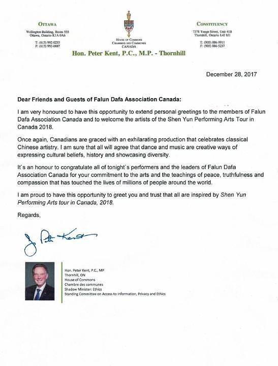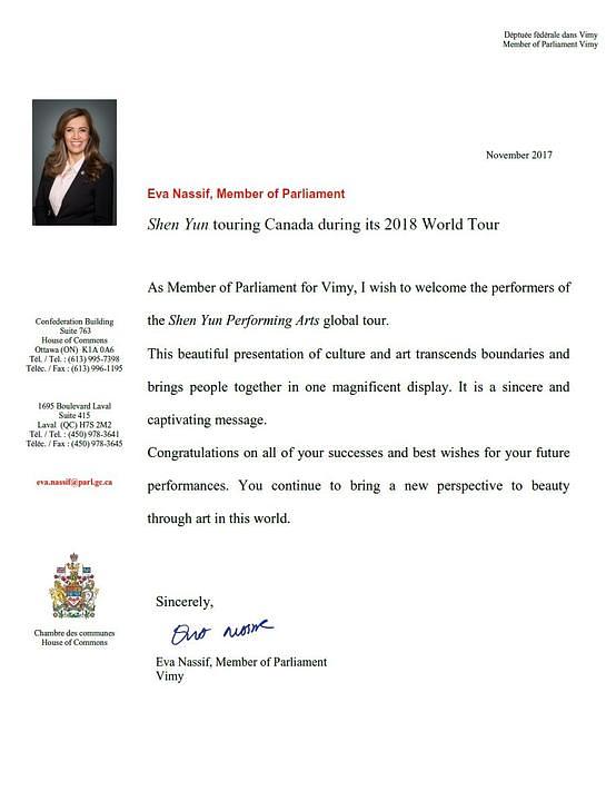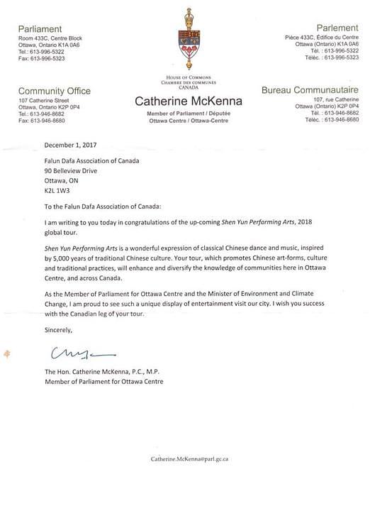 MP Catherine McKenna u svome pismu kaže: "Shen Yun Performing Arts je prekrasan izraz kineskog plesa i muzike nadahnut sa 5.000 godina tradicionalne kineske kulture. Vaša turneja koja promoviše kineske umjetničke forme, kulturu i tradicionalnu praksu će potaknuti i proširiti znanje o društvenim zajednicama ovdje u 'Ottawa centru' i širom Kanade".