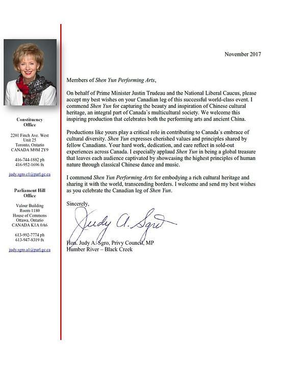 MP Judy Sgro je u svome pismu kazala: "Produkcije poput vaše igraju krucijalnu ulogu doprinoseći kanadskom prihvaćanju kulturnih različitosti. Shen Yun izražava cijenjene vrijednosti i principe koje dijele i kolege kanađani. Vaš naporni rad, posvećenost i briga su rezultirali rasprodanim predstavama širom Kanade…Ja pozdravljam Shen Yun Performing Arts zato što objedinjuje bogato kulturno nasljeđe i dijeli ga sa svijetom, transcendirajući granice. Ja vas pozdravljam i šaljem najbolje želje dok vi slavite Kanadski ogranak Shen Yuna."