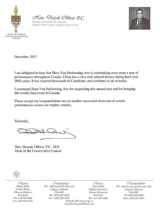 MP Deepak Obhrai je rekao: "Oduševljen sam što čujem da će Shen Yun Performing Arts još jednom poduzeti turneju nastupajući širom Kanade. Kina ima veoma bogatu kulturnu istoriju koja seže od prije 5.000 godina. Ona je nadahnjivala hiljade Kanađana, a tako nastavlja činiti i danas."