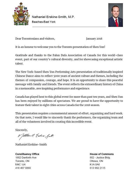 MP Nathaniel Erskine-Smith kaže: "Prezentacija tradicionalnog kineskog plesa koju donosi Shen Yun Performing Arts sa sjedištem u New Yorku želi oslikati 5.000 godina staru kulturu i vrijeme, uključujući teme kao što je suosjećajnost, hrabrost i nada. Ovo je prilika da ovu miroljubivu poruku podijelimo sa prijateljima i porodicom. Događaj oslikava izvanrednu kinesku istoriju u dojmljivoj i inspirativnoj predstavi i doživljaju."