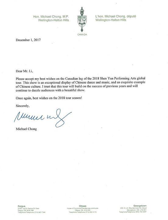 MP John Aldag je kazao: "Želim vam pružiti svesrdnu podršku vašem radu na širenju kineskog kulturnog nasljeđa, koje ostaje sasatavni dio kanadskog multikulturnog društva. Također vam želim prenijeti moje izraze zahvalnosti što svoju umjetnost dijelite sa Kanađanima pružajući nam priliku da gledamo ovako uzbudljivu predstavu. Dok krećete sa vašom turnejom po cijeloj zemlju u osam kanadskih gradova u periodu od 28. decembra i 25. marta u sklopu vaše turneje svjetske klase 2018. godine, želim da vam čestitam na cjelokupnom vašem napornom radu i onome što ste postigli."