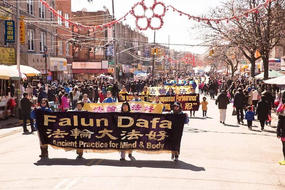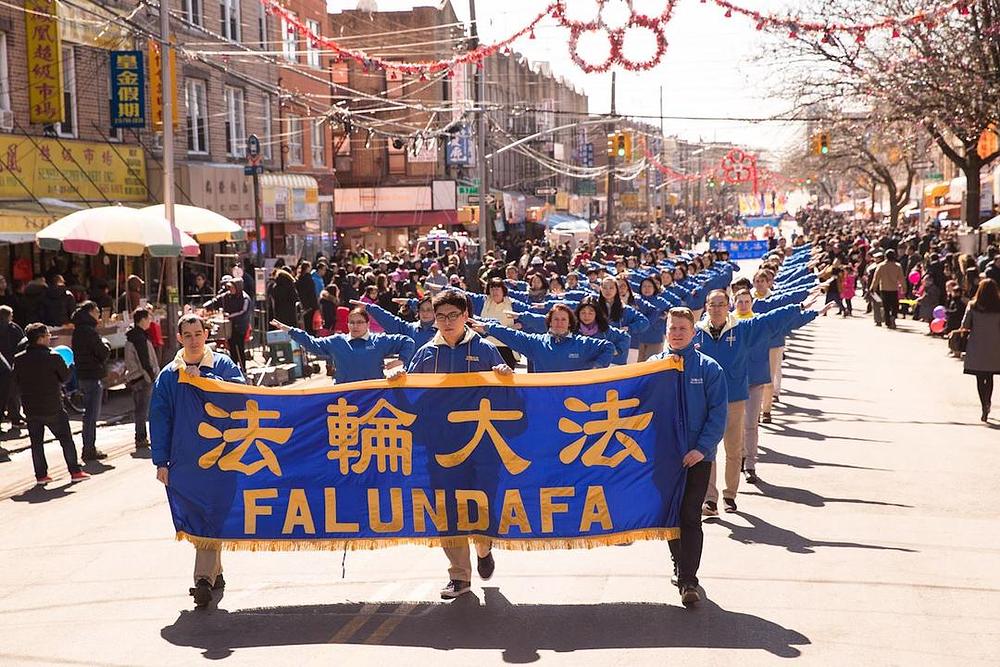Praktikanti su održali višestruku paradu uzduž 8. avenije po kojoj su marširali 14 blokova. Gledaocima su predstavljeni tradicionalni zmajev i lavlji ples, lijepo ukrašena pokretna ostrva, uzbudljivi marširajući limeni orkestar i trijumfalna dobošarska grupa. Na paradi su bile nošene zastave i transparenti koji su govorili o koristi od prakticiranja ove prakse, o nepravednom progonu u Kini, kao i čestitke stotinama miliona kineskih građana koji su napustili Komunističku partiju Kine (KPK) i njoj pridružene organizacije.