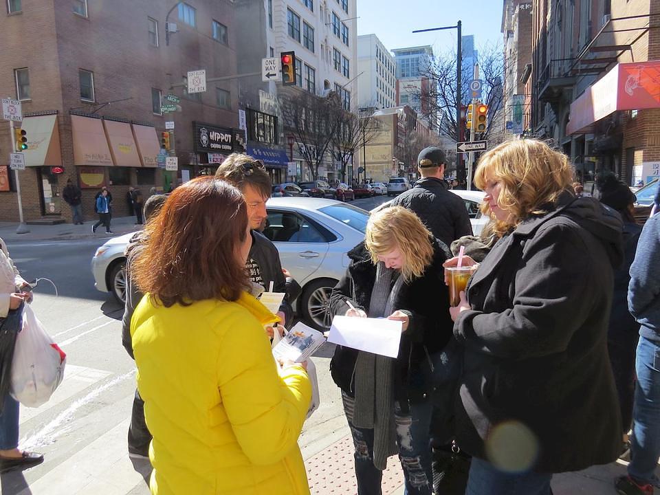Falun Gong praktikanti su se, 24. marta 2018. godine, okupili u Kineskoj četvrti u Philadelphiji. Dan je bio sunčan nakon nedavne snježne oluje i prepun svježeg vazduha kojeg je donio rani proljetni povjetarac. Oni su se okupili kako bi odali počast za više od 300 miliona Kineza koji su se odrekli organizacija u sklopu Komunističke partije Kine, što predstavlja prekretnicu u napretku prema duhovnoj slobodi u Kini, kao i napredak ka njenoj svjetlijoj budućnosti.