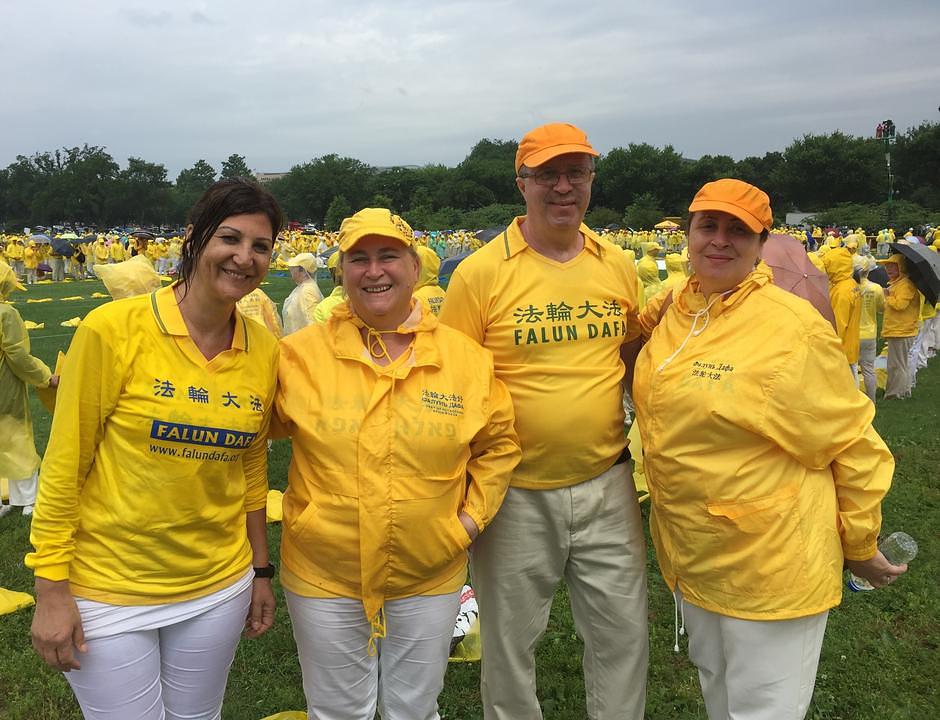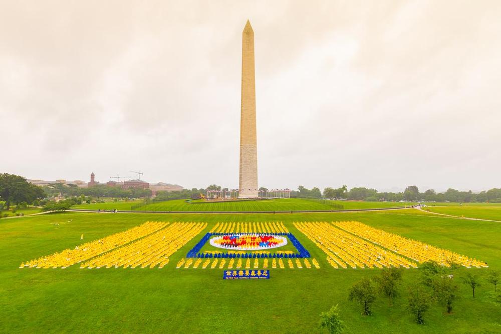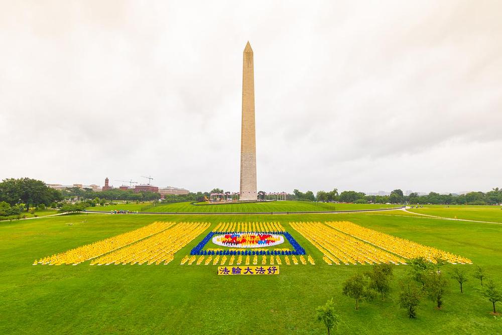 Falun Gong praktikanti pristigli iz cijelog svijeta su u jutro 22. lipnja 2018. organizirali grupno vježbanje i formiranje Falun znaka ispred spomenika Washingtonu. Iako je padala kiša, a ponekad bio i jak pljusak, praktikanti su ustrajali u vježbanju. Kasnije su odjeveni u odjeću različitih boja formirali Falun znak. Scena je odavala dojam spokoja i odlučnosti.
