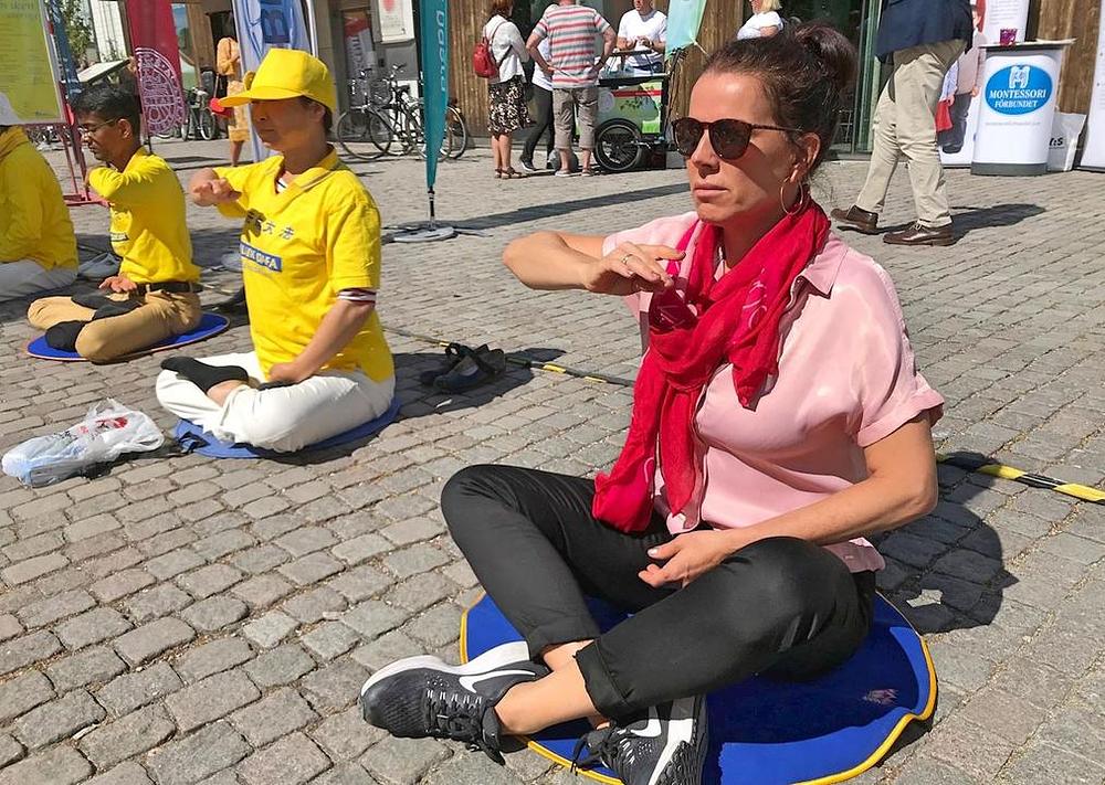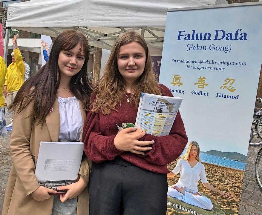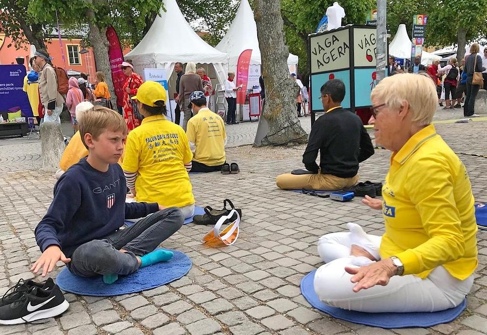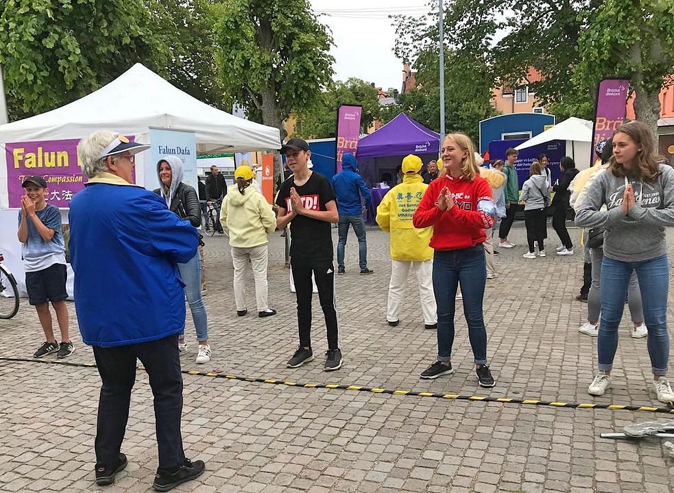Falun Gong praktikanti su već nekoliko godina prisutni na Almedalen nedjelji. Postavili su informativne transparente i podučavali vježbe zainteresiranima. Kao i prethodnih godina, Falun Gong šator je bio popularno odmorište za posjetioce raznih starosnih grupa. Ove godine su najveću grupu posjetilaca činili mladi ljudi u dobi od 10 do 30 godina. Zaustavljali su se u grupama i odmah željeli učiti vježbe od praktikanata.