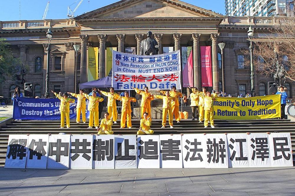Praktikanti Falun Gonga iz Melbourna su se okupili 14. jula 2018. godine ispred Državne biblioteke kako bi podizali svijest građana o 19. godina dugom progonu ove prakse u Kini. Na skupu su govorili brojni izabrani zvaničnici i lideri zajednice, koji su pohvalili napore praktikanata Falun Gonga da pomognu u zaustavljanju ovoga progona.
