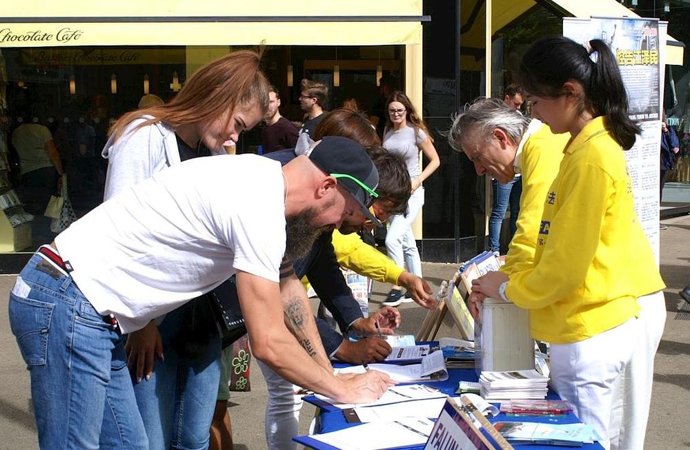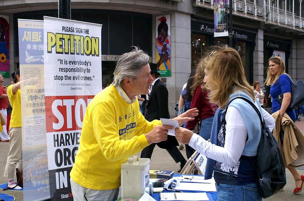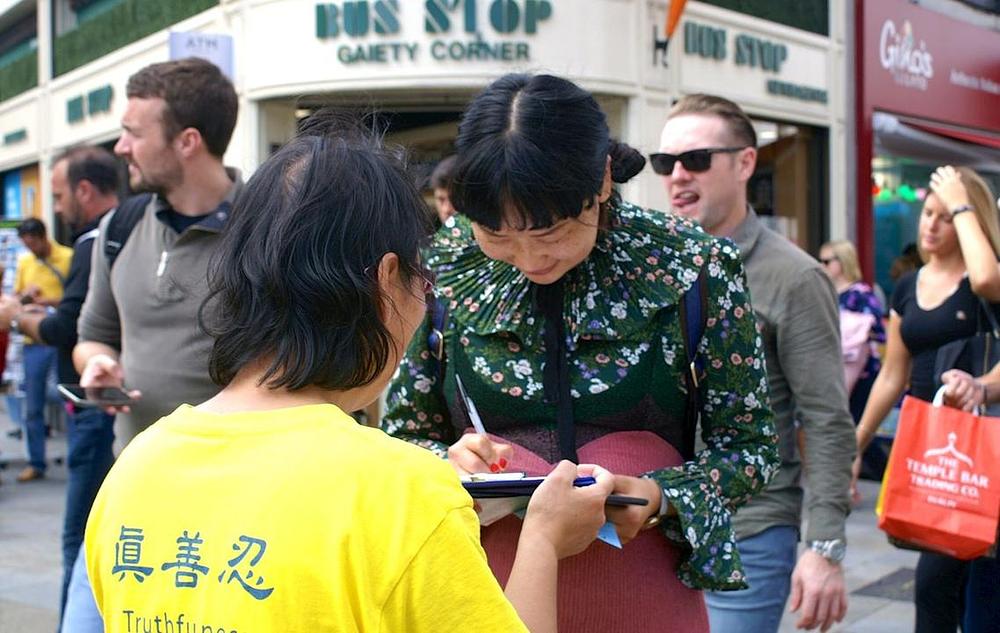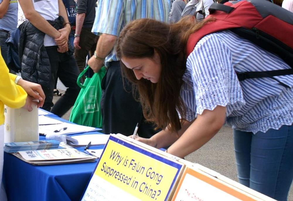 Jedna je mlada žena potpisala peticiju i rekla da veoma dobro poznaje Falun Gong. Rekla je da su ona i njeni roditelji živjeli blizu kineske ambasade. Često je gledala mirne proteste praktikanata ispred ambasade. Ona je rekla da su ljudi koji žive u blizini ambasade bili dirnuti istrajnošću praktikanata.