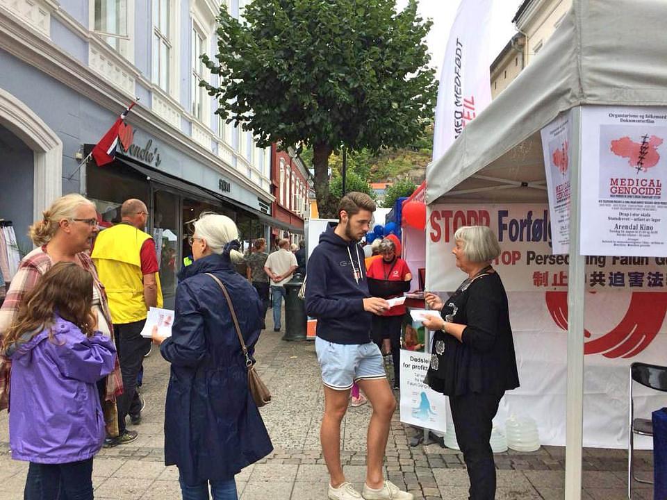 Falun Gong praktikanti su postavili štand kako bi na ovoj manifestaciji podizali svijest javnosti i pozvali posjetioce da prisustvuju projekciji dokumentarnog filma o zločinima žive žetve organa koje nad praktikantima Falun Gonga i drugim zatvorenicima prigovora savjesti čini komunistički režim.