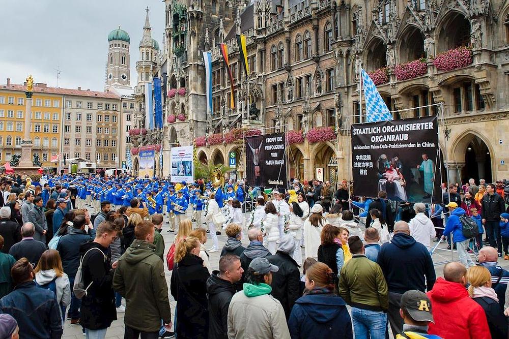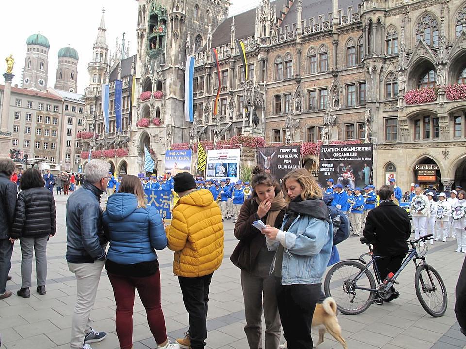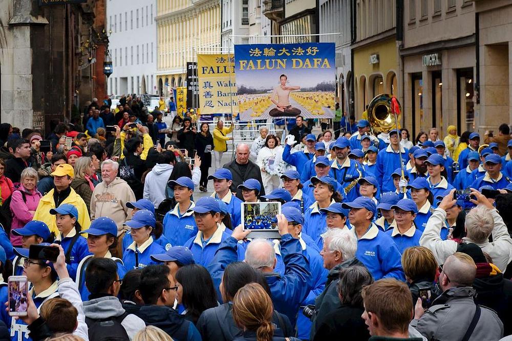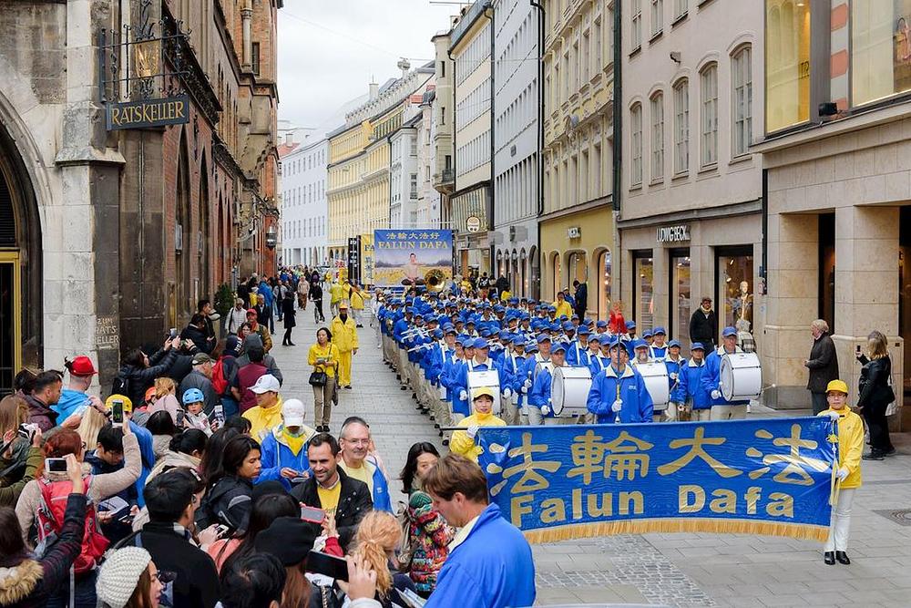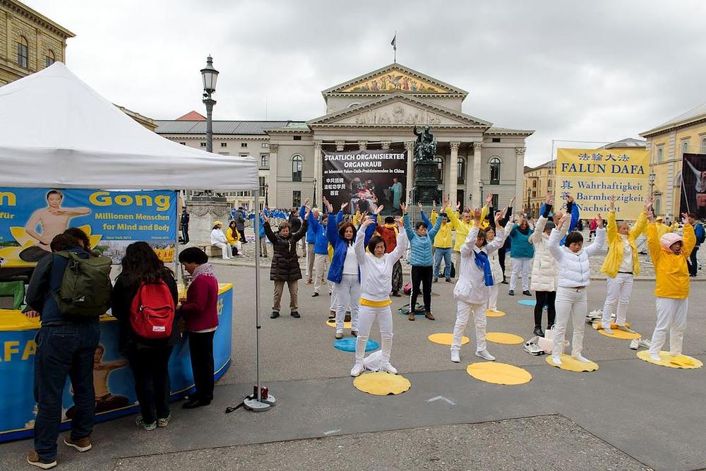 Praktikanti su održali povorku i dva skupa, jedan na Marienplatzu, a drugi na Max-Joseph-Platzu, velikom trgu nasuprot Munich Residenz i čuvene povijesne Operske kuće. Posjetioci su se radi informisali o ovoj drevnoj meditativnoj praksi, a mnogi su na licu mjesta odlučili potpisati peticije pozivajući da se zaustavi progon u Kini.