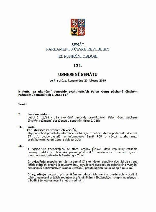 Rezolucija br. 131 je usvojena 20. marta 2019. godine. Ona poziva češkog predsjednika i vladu da zahtijevaju od Kine da se pridržava međunarodnih konvencija o ljudskim pravima tako što će okončati progon ovih grupa i osloboditi sve zatvorenike savjesti.