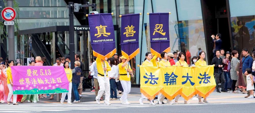 Falun Dafa praktikanti u Japanu proslavili su Svjetski Falun Dafa dan i rođendan Učitelja Li Hongzhi-a, velikom povorkom u Ginza, u Tokiju, 6. svibnja 2019. godine.