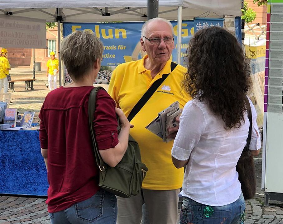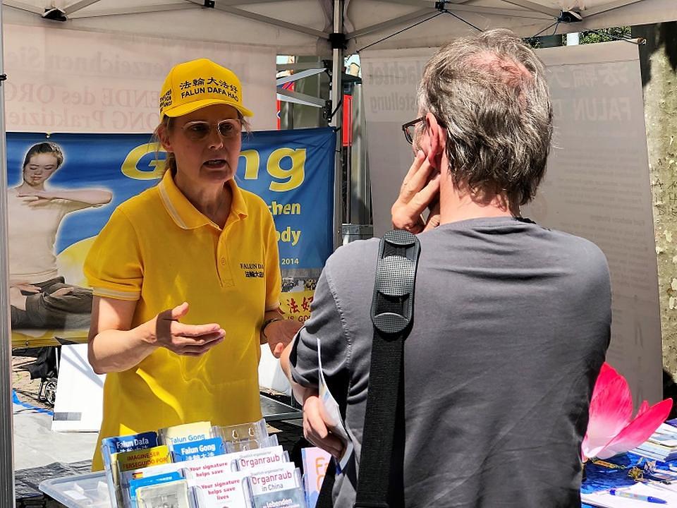 Žena iz Njemačke pitala je praktikante o progonu koji se događa u Kini. Često je putovala u Kinu zbog posla i upravo se vratila iz Kine prošlog tjedna. Osjećala se kao da je stalno pod nadzorom u Kini i rekla je da postoji stroga internetska cenzura. Ona se slaže s učenjima Dafa i vjeruje da će se promjene u Kini dogoditi samo onda, kada više ljudi sazna istinu. Prije nego što je otišla, zatražila je softver za probijanje internetskog vatrozida (internet firewall). Ona želi pomoći Kinezima da saznaju istinu pri svom sljedećem putovanju u Kinu.