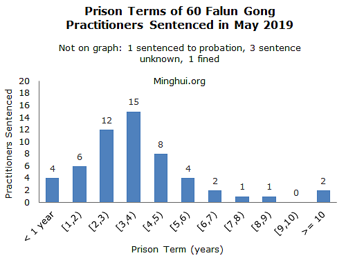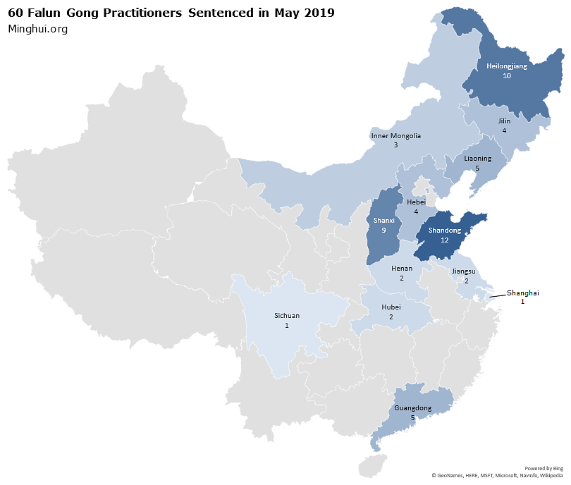 Prema podacima koje je prikupio Minghui.org, u maju 2019. je zabilježeno 60 novih slučajeva praktikanata Falun Gonga osuđenih na zatvor od strane sudskog sistema Kineske komunističke partije (KPK).