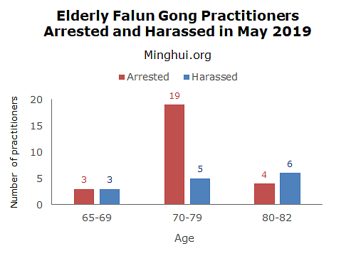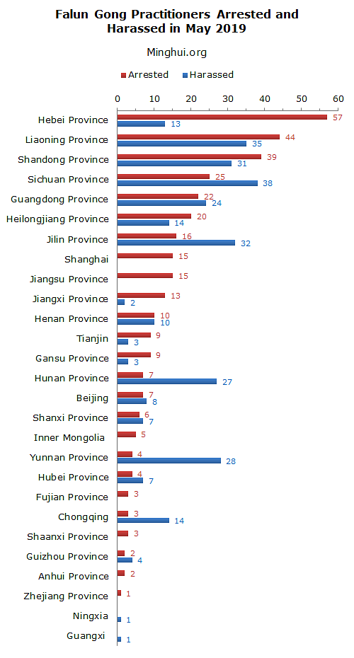Hapšenja u maju 2019. godine su se desila u 25 provincija i centralno kontrolisanih opština. U jedanaest su oblasti prijavljeni dvocifreni slučajevi hapšenja. Provincija Hebei je imala najviše, (57), a zatim slijede pokrajina Liaoning sa 44 i provincija Shandong sa 39 hapšenja.