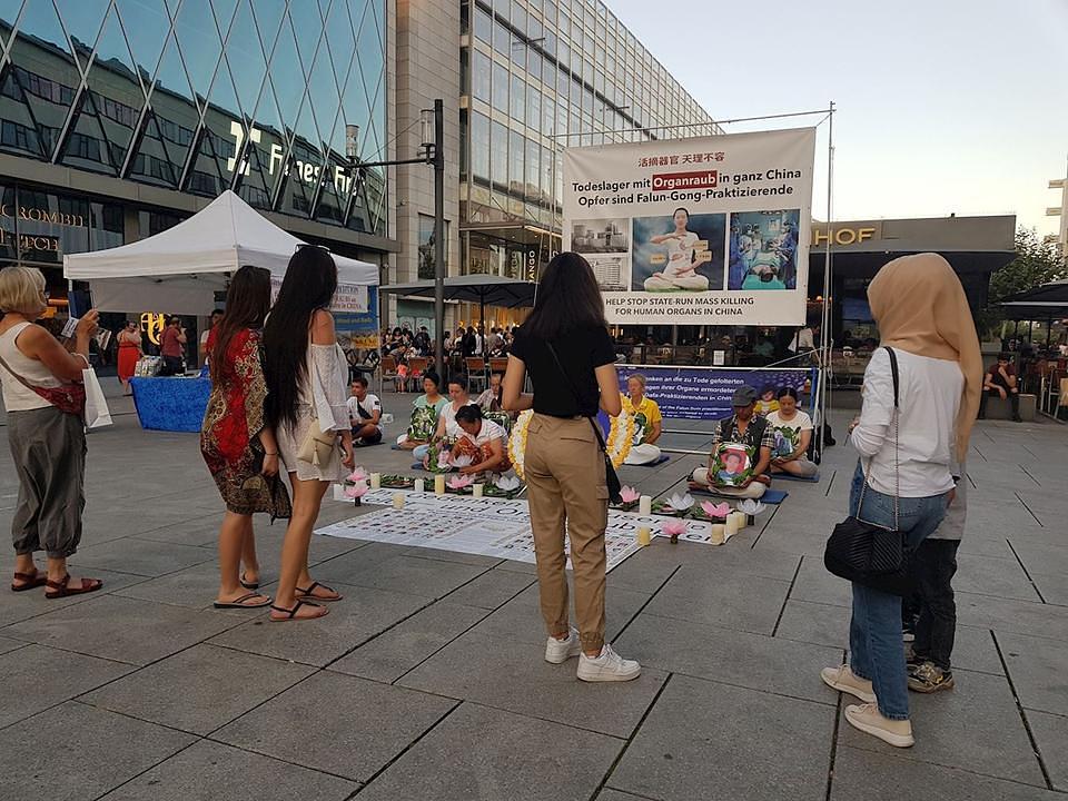 U ulici Zeil, jednom od najpoznatijih i najprometnijih trgovačkih područja, Falun Dafa praktikanti su postavili velike plakate i dijelili informativne materijale na obližnjem štandu u periodu od 30. avgusta i 1. septembra.