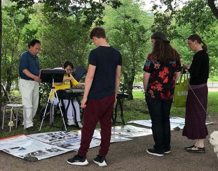 Zatim smo počeli svirati. Norvežani bi nas ponekad u skupinama došli poslušati. Po završetku pjesme bi nas nagradili pljeskom. Zatim bi im praktikant pričao o Falun Dafa i progonu praktikanata u Kini. Shvatili bi poruku, uzeli letak te krenuli dalje svojim putom.