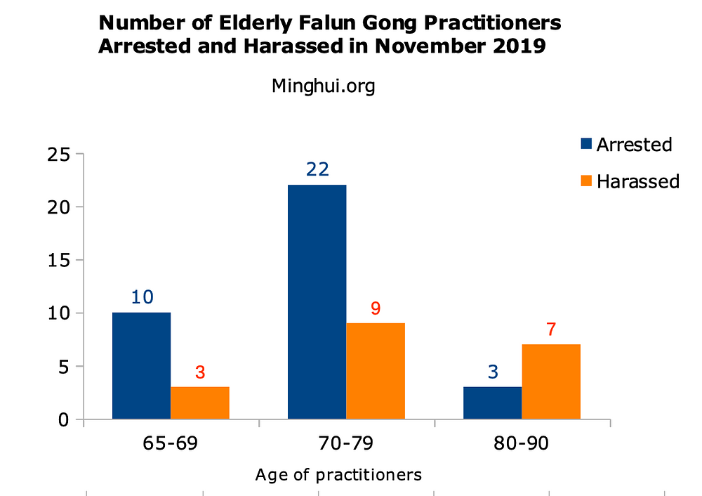 Pedeset četvero uhapšenih praktikanta ima 65 ili više godina, a najstarijem je 85 godina. Zabilježimo je da su kod četiri starija praktikanta suspendirane penzije ili im je naređeno da vrate penzije koje su primali dok su bili prethodno zatvoreni zbog svoje vjere. Ukupan gubitak praktikanata je bio je najmanje 368.599 yuana.