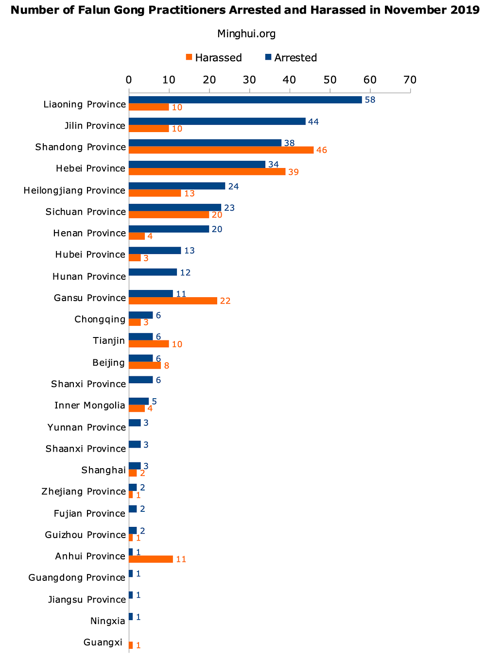 Prema informacijama koje je sakupio Minghui.org, u novembru 2019. godine u Kini je uhapšeno 325 praktikanata Falun Gonga, a njih 20 je maltretirano zbog njihove vjere. Najmanje je 207 praktikanata ostalo u pritvoru ili se vode kao nestali u trenutku pisanja ovog izvještaja.