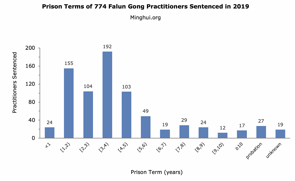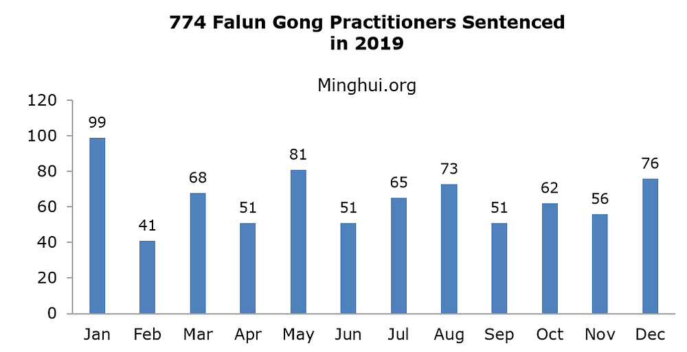 Prema podacima koje je prikupio Minghui.org potvrđeno je da su najmanje 774 praktikanta Falun Gonga osuđeni zbog svoje vjere u 2019. godini.