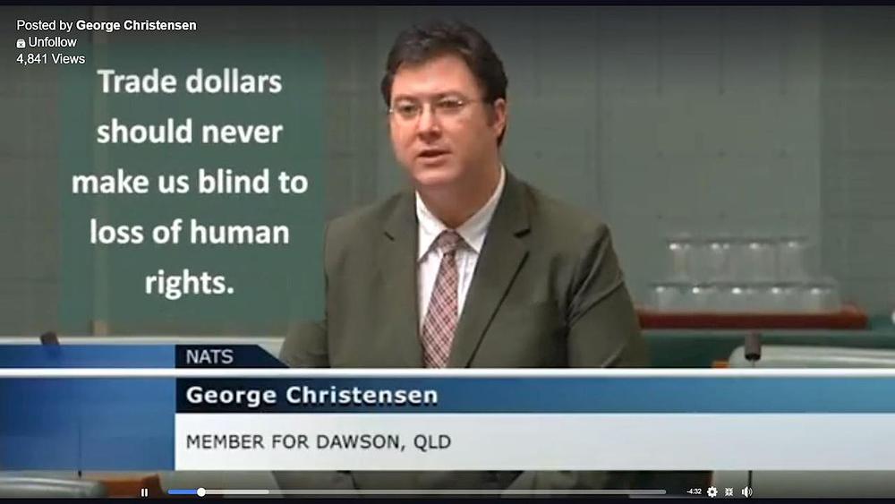 George Christensen je postao član Predstavničkog doma nakon što je pobijedio na saveznim izborima 2010. godine u izbornoj jedinici Dawson. On je također predsjedavajući Zajedničkog stalnog odbora za unapređenje trgovine i investicija. On je kazao: „Ohrabruje to što je nekoliko stotina miliona Kineza izjavilo da više ne žele biti dio komunističkog režima. Ovo predstavlja nadu za obnovu slobodnog društva u Kini."