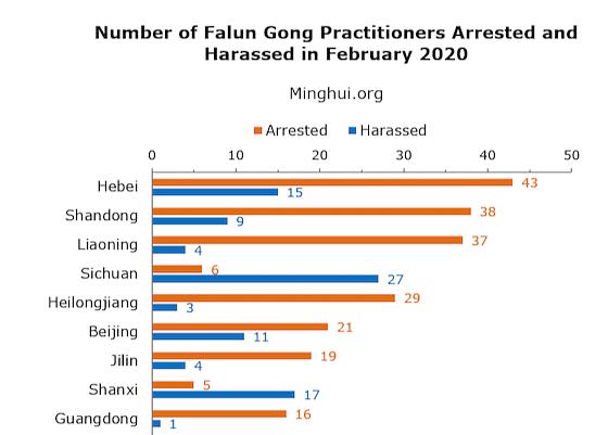 Od 395 praktikanata koji su uhapšeni ili maltretirani zbog svoje vjere u februaru 2020. godine, 16 njih je bilo u sedamdesetim, a 5 u osamdesetim godinama života. Kod ukupno 193 praktikanta je izvršena premetačina domova. Vlasti su od 26 praktikanata iznudile ukupno 244.234 yuana ili u prosjeku 9.394 yuana po osobi.
