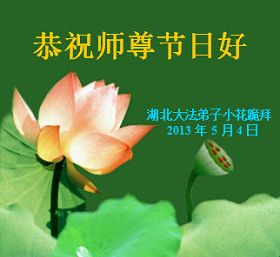Među čestitkama koje pristižu iz provincije Hubei je i čestitka jedne obitelji praktikanata iz Tuanfeng okruga, grada Huanggang u kojoj su napisali: " Poštovani Učitelji, sa svakim dolaskom Vašeg rođendana nas obuzmu emocije, jer nakon tisuća godina čekanja, napokon smo primili Dafa univerzuma kojeg je stvorio Učitelj. Također smo tužni zbog klevete od strane zlobne partije i napada starih sila. Učitelj je pretrpio jako puno za nas."