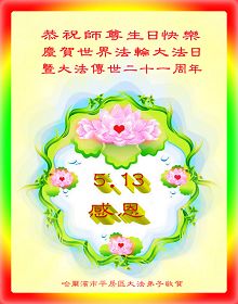 Praktikanti u sledećim distriktima i okruzima u Harbinu slave Svetski dan Falun Dafe i 21. godišnjicu predstavljanja Dafe javnosti, i s poštovanjem žele milostivom Učitelju srećan rođendanan!