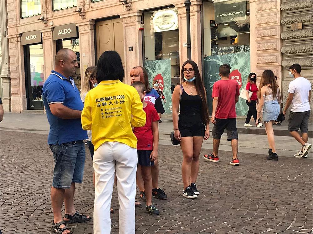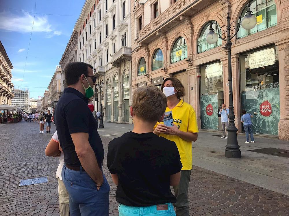Praktikanti su održali aktivnosti predstavljanja Falun Dafa (naziva se i Falun Gong) u Milanu, u Italiji, 4. srpnja 2020. Oni su razotkrili progon ove prakse od strane Komunističke partije Kine (KPK), posebno žetvu organa od živih praktikanata, odobrenu od vlasti u Kini.