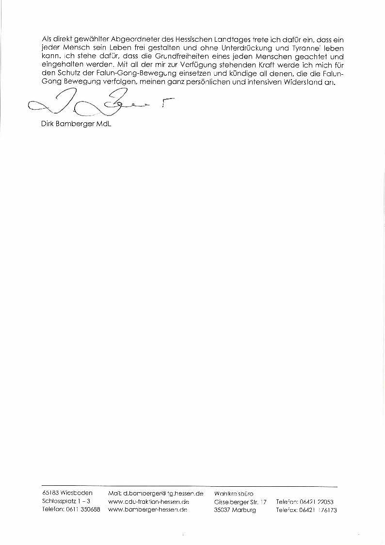 MSP Dirk Bamberger iz Njemačke Kršćansko-demokratske unije (CDU) napisao je pismo bez oklijevanja. Izrazio je svoju podršku nastojanjima Falun Gong praktikanata za ostvarenje pravde, priznanja i tolerancije.