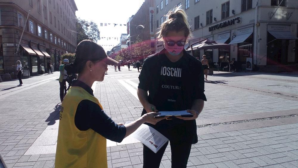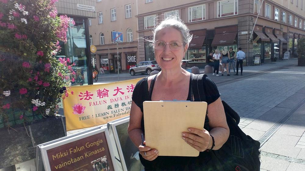Praktikanti su postavili plakate i transparente na Yliopistonkatu, širokoj ulici u kojoj se trgovine i supermarketi nalaze s obje strane. Praktikanti su s ljudima razgovarali o tome šta je Falun Gong i zašto Komunistička partija Kine (KPK) progoni praktikante u Kini. Nakon što su saznali za surovosti progona, mnogi su građeni potpisali praktikantsku peticiju.