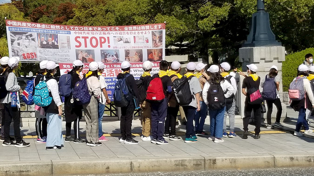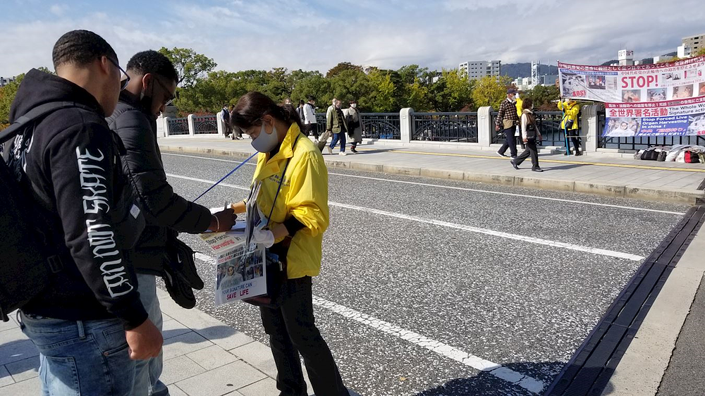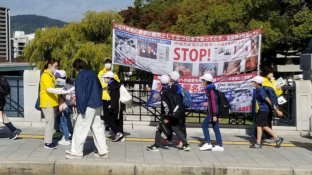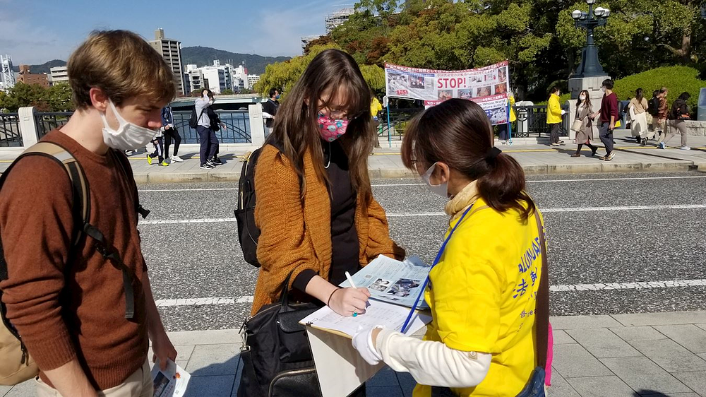 Ljudi koji posjećuju Spomen-park mira u Hirošimi doznaju činjenice o progonu u Kini i potpisuju peticije podrške praktikantima.