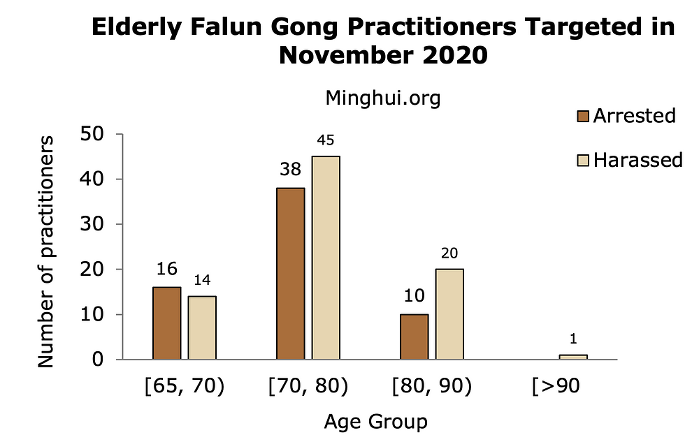 Ukupno 144 praktikanata koja su bila na meti progona, uključujući 64 uhapšena i 80 maltretiranih , su bili stariji od 65 godina, a najstariji su bili stariji od 90 godina. Trideset i jedan praktikant je bio stariji od 80 godina.