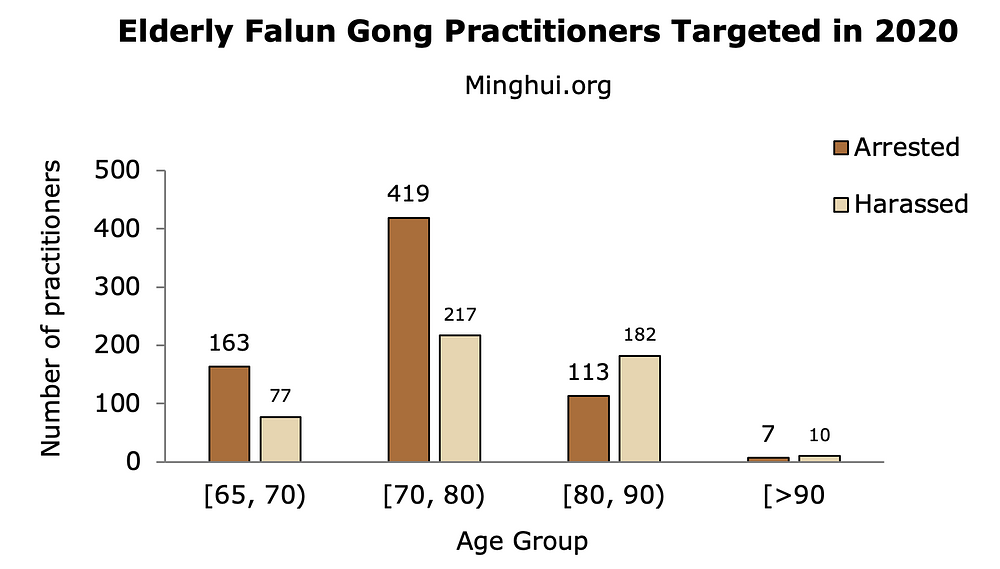 Na meti progona u 2020. godini je bilo i više starijih praktikanata. Tako je bilo 1.188 (7,8%) praktikanata starijih od 65 godina uhapšenih ili maltretiranih u 2020. godini, što je dvostruko više u odnosu na njih 583 u 2019. godine. U starosnoj grupi između 70 do 80 godina, 2020. godine je uhapšeno 419 praktikanata. Sedamnaest ih je bilo starije od 90 godina, a najstariji je imao 94 godine.
