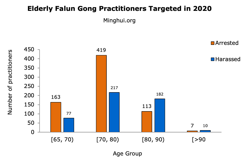 Prema podacima koje je prikupio Minghui.org između 1. januara i 31. decembra 2020. godine, ukupno je bilo progonjeno 1.334 praktikanta starija od 65 godina, u šta se ubraja 702 praktikanta koji su uhapšeni i njih 476 koji su maltretirani; osuđeno je još 114 praktikanata, a najduža izrečena kazna je bila 12 godina; 42 praktikanta su bila progonjena do smrti, a njih je 13 umrlo u pritvoru.