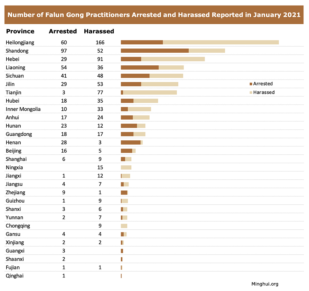 Praktikanti za koje je izviješteno da su se našli na meti progona u januaru mjesecu 2021. godine su iz 155 gradova u 29 provincija i općina. Pokrajine Heilongjiang (226 = 60 hapšenja + 166 slučajeva maltretiranja), Shandong (149), Hebei (120), Liaoning (90) i Sechuan (89) su predvodile listu s najviše slučajeva progona. U još je 15 regija je zabilježen dvocifreni broj slučajeva, a 9 pokrajina su evidentirani jednocifreni slučajevi.
