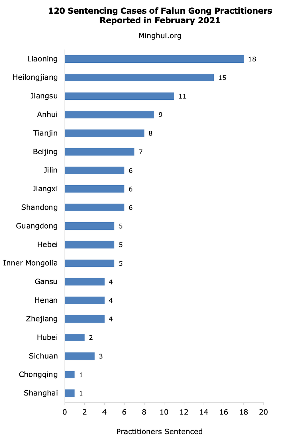 U februaru mjesecu 2021. godine Minghui.org je potvrdio da je još 120 Falun Gong praktikanata osuđeno zbog svoje vjere, a to uključuje i 47 praktikanata osuđenih u 2020. godini, 12 u januaru 2021. i 61 u februaru 2021. godine.