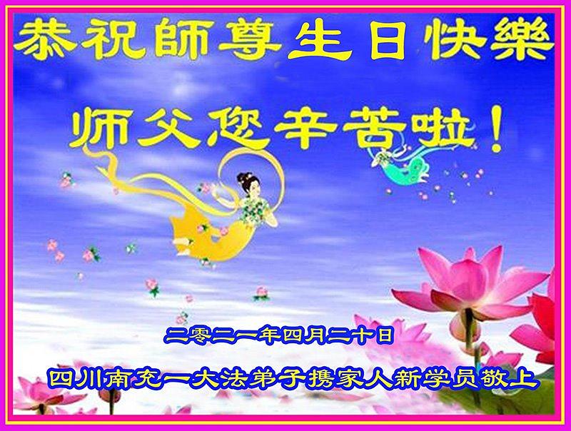 „Povodom Svjetskog Dana Falun Dafa, moja porodica i ja želimo Učitelju sretan rođendan! Iako sam novi praktikant koji prakticira manje od dvije godine, Učitelj se brižno odnosio prema meni. Kad se dobro ne kultiviram, dajete mi nagovještaje i potičete me da se ponašam u skladu s vašim učenjima. Kad radim dobro, potičete me da i dalje budem marljiv. Osjećam kako vrijeme brzo prolazi i žurim sa učenjem Fa, izvođenjem vježbi i prakticiranjem kultivacije."