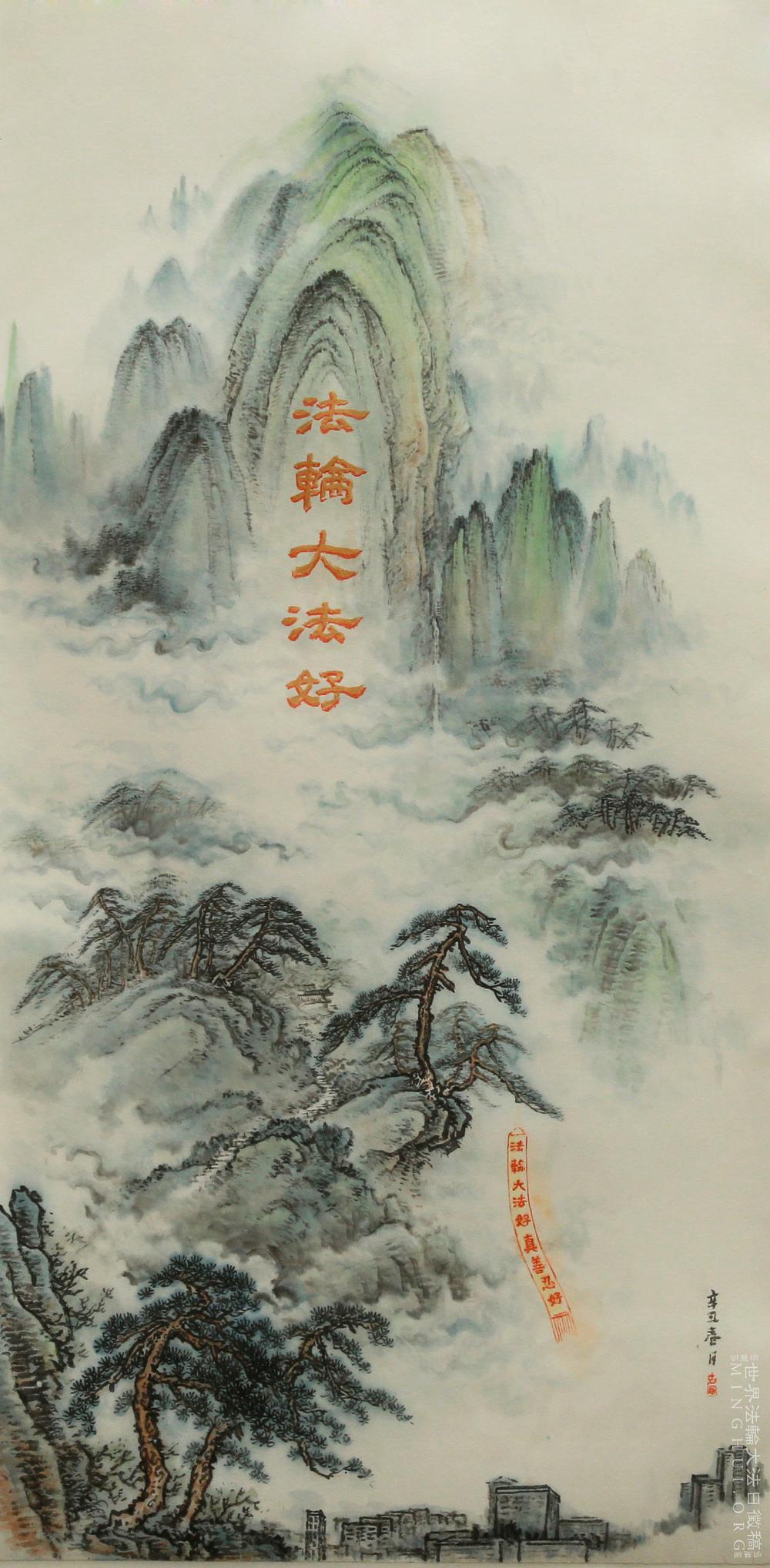 Falun Dafa je sustav meditacije od kojeg je imalo koristi oko 100 milijuna praktikanata širom svijeta. Njegovi principi: Istinitost-Dobrodušnost-Tolerancija su također univerzalne vrijednosti. Ova slika pokazuje da se u ljudskom svijetu, božanskom svijetu i kozmosu slavi poruka "Falun Dafa je dobar" i "Istinitost- Dobrodušnost-Tolerancija". Riječi na planini glase: "Falun Dafa je dobar", a na transparentu piše: "Falun Dafa je dobar i Istinitost-Dobrodušnost-Tolerancija je dobra."