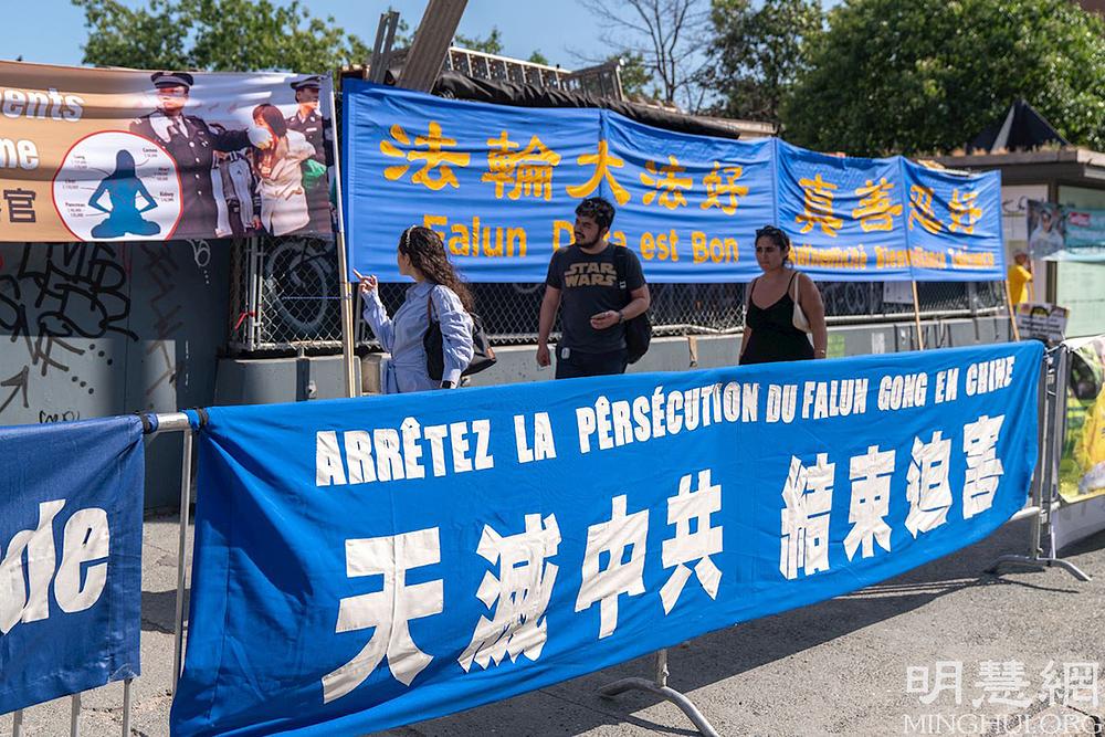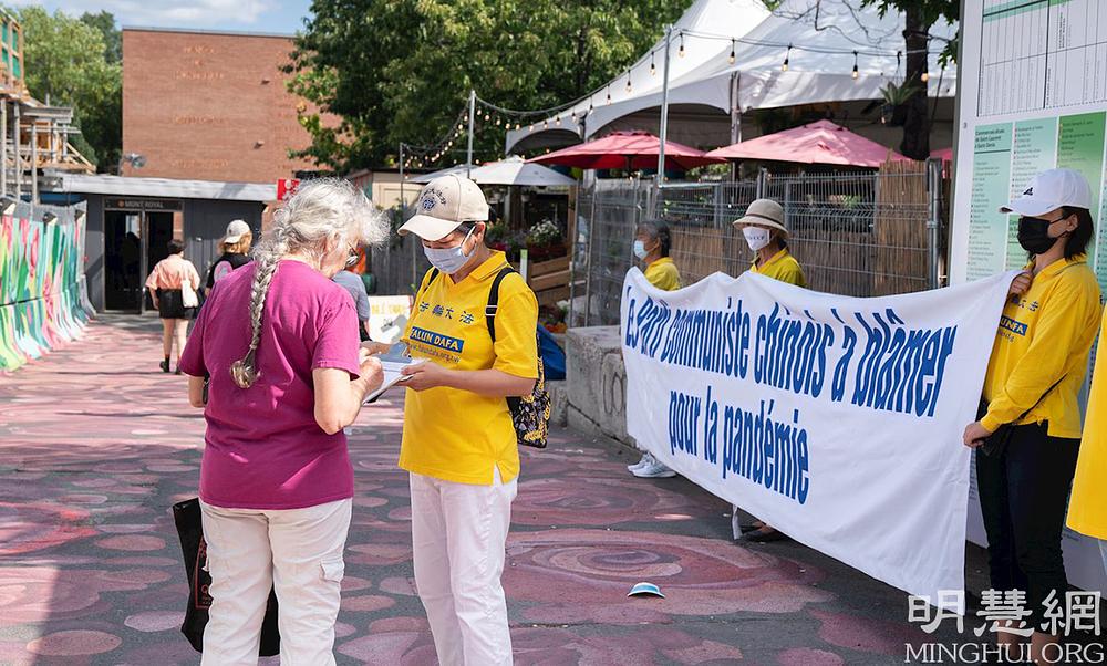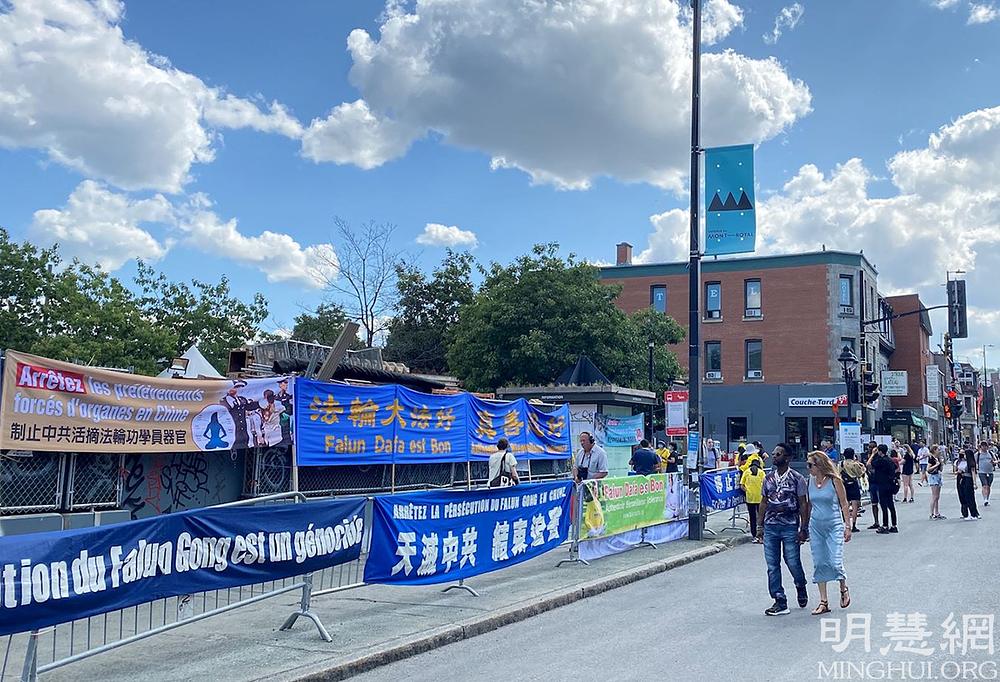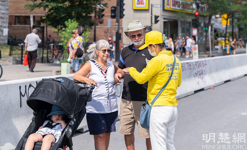 Transparenti i plakati s detaljima o aktuelnom progonu Falun Dafa u Kini su bili izloženi na Aveniji Mont-Royal u Montrealu 14. avgusta 2021. godine. Dok su se prolaznici okupljali da pročitaju informacije, praktikanti su im objašnjavali kako je Komunistička Partija Kine (KPK) progonila ovu duhovnu praksu već protekle 22 godine.