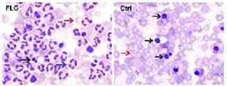 Gornja slika prikazuje neutrofile izolirane iz uzoraka krvi koji su držani izvan tijela 16 sati. Slika s lijeve strane bila je od Falun Dafa praktikanta, gdje je većina neutrofila bila živa i zdrava (prikazano plavom strelicom). Slika s desne strane bila je od zdravog dobrovoljca, čija je većina neutrofila bila mrtva (prikazano crnom strelicom). Crvene strelice označavaju crvena krvna zrnca.