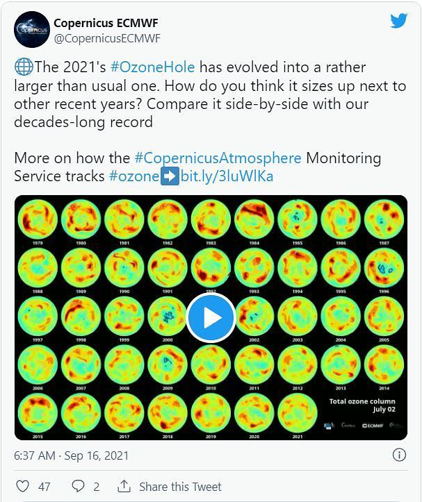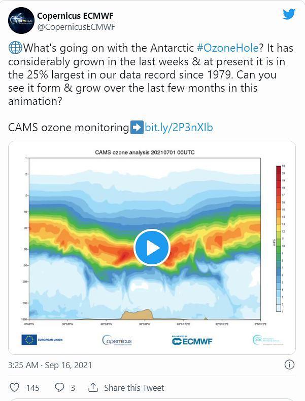 Služba za nadzor atmosfere Copernicus (CAMS), agencija koja djeluje pri Europskoj komisiji, objavila je 16. rujna, da su znanstvenici otkrili da se rupa u ozonu iznad Antarktika značajno povećala od početka rujna. Sada je veća od Antarktika.