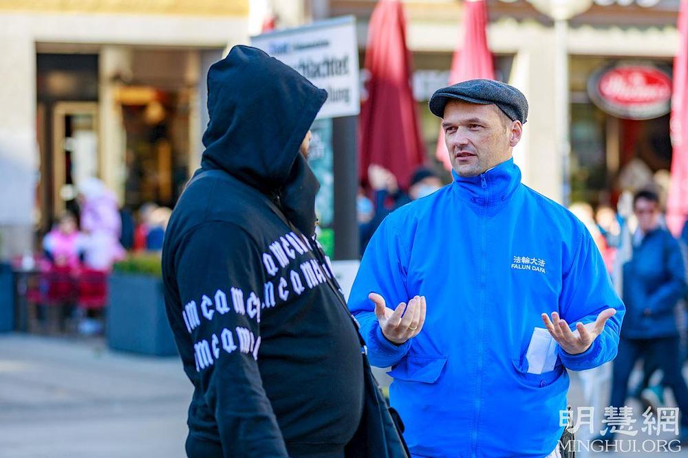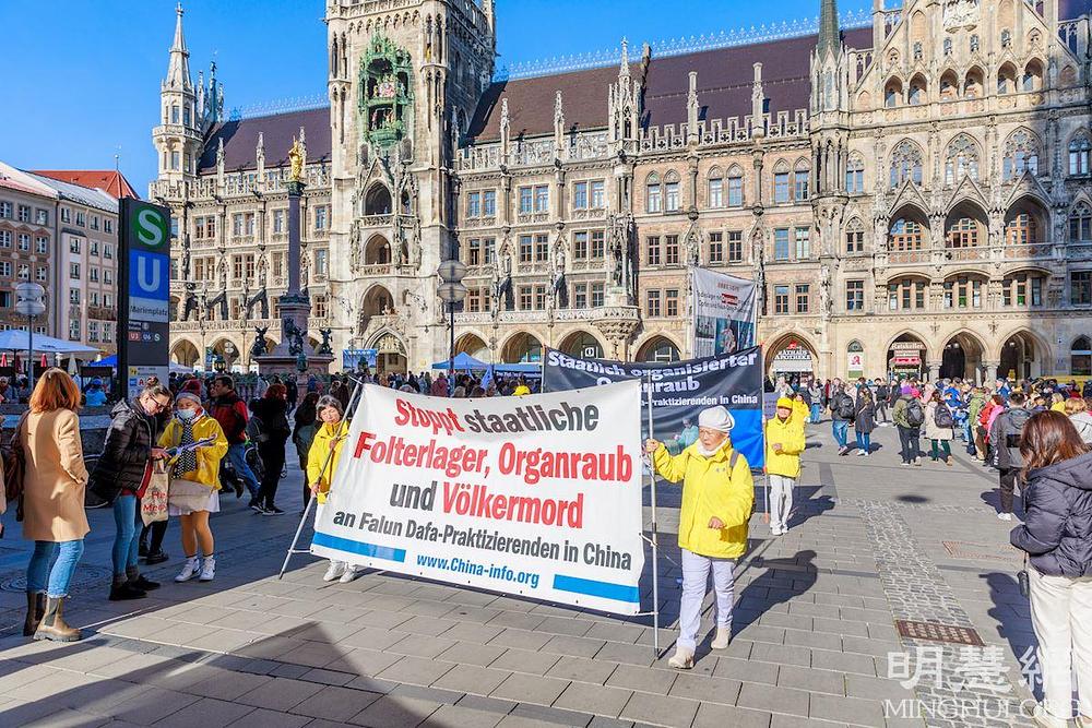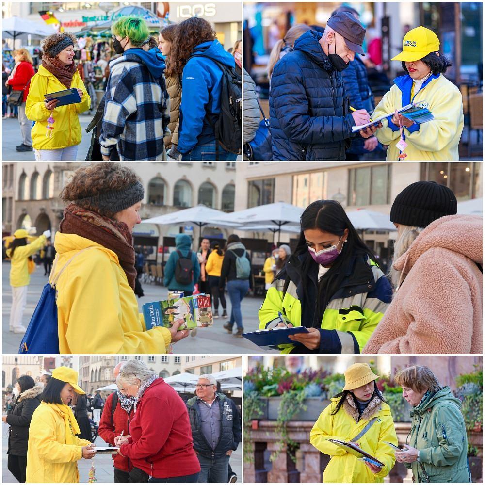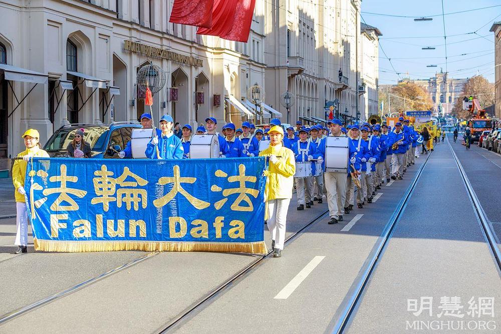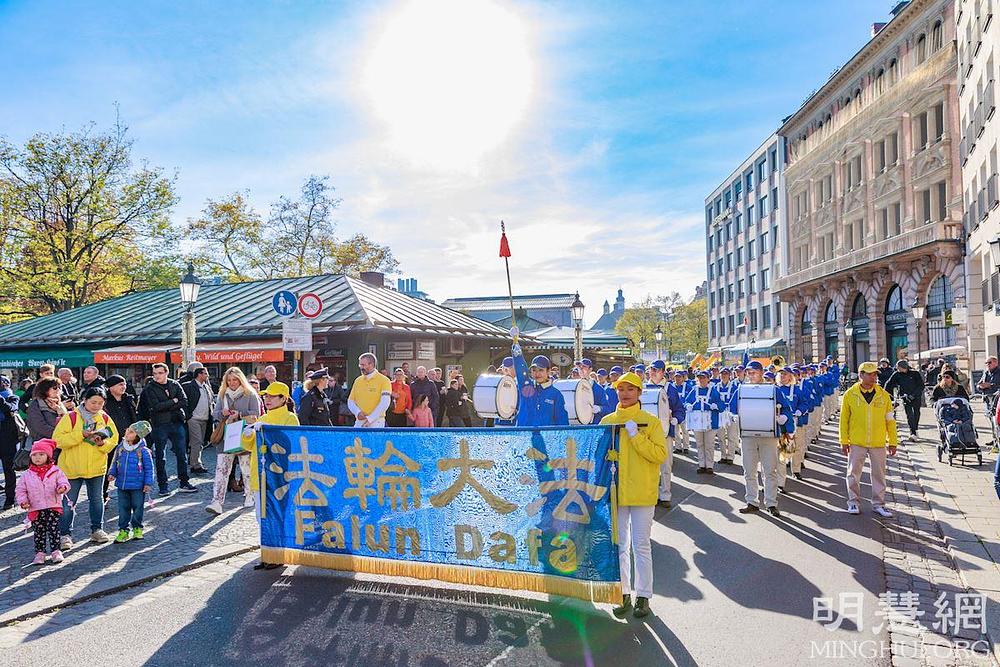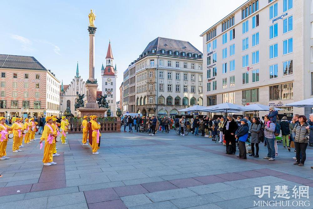 München je glavni grad Bavarske i treći po veličini grad u Njemačkoj te je središte kulture, ekonomije i politike. Mnogi su ljudi bili vani uživajući u lijepom jesenskom vremenu i zastali su gledati i slušati aktivnosti praktikanata. Nastupili su Tian Guo Marching Band i tim bubnjara. Tim za ples zmajeva sastojao se od praktikanata koji su doputovali iz Poljske i Češke. Mnogi su se okupili gledati i oduševljeno pljeskali.