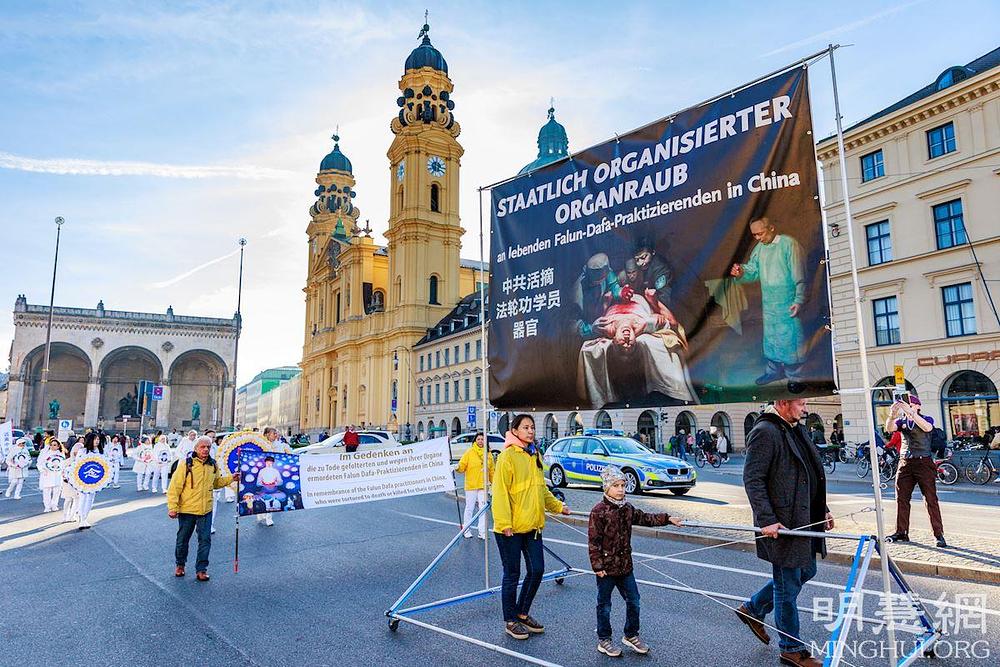 Nakon skupa na Marienplatz-u, praktikanti su marširali kroz Viktualienmarkt, Tal i Maximilianstraße te prošli pored Nacionalnog kazališta kao i Residenz-a (bivša kraljevska palača). Odatle su zatim prošli kroz Odeonsplatz prije nego što su se vratili na Marienplatz. Mnogi ljudi su čitali materijale o Falun Dafa i 22 godine progona u Kini. Neki su praktikantima pokazali palac gore i potpisali peticiju koja poziva na prekid progona.