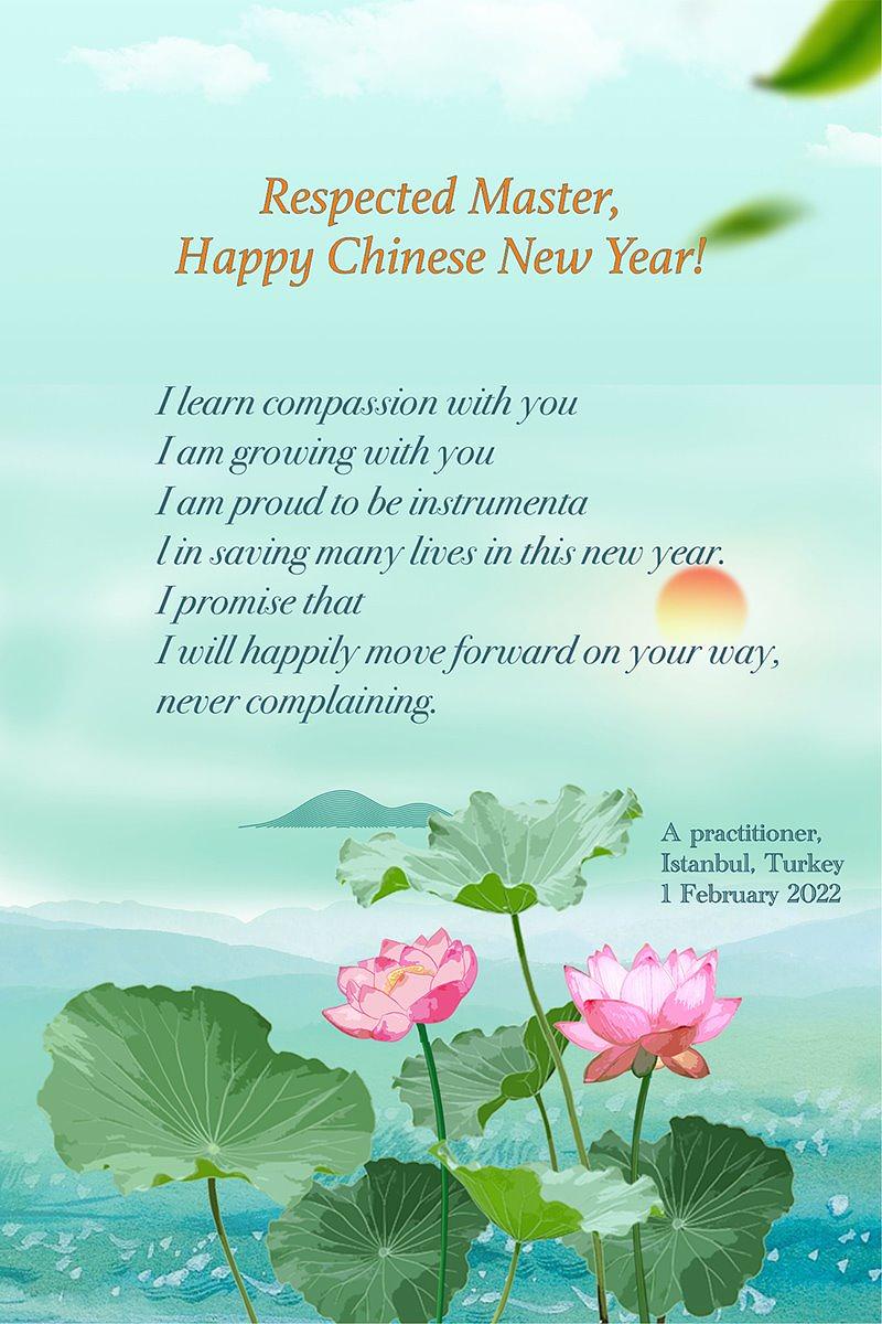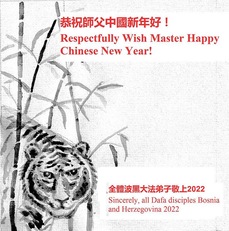 Kineska Nova godina počela je 1. veljače i praktikanti iz različitih zemalja su poslali svoje iskrene pozdrave na Minghui.org kako bi g. Li Hongzhiju, osnivaču Falun Dafa, poželjeli sretnu kinesku Novu godinu! Sretni su što imaju ovu neviđenu priliku za kultiviranje i istinski su zahvalni Učitelju na suosjećajnoj brizi te su odlučni dobro kročiti predstojećim putom kultivacije.