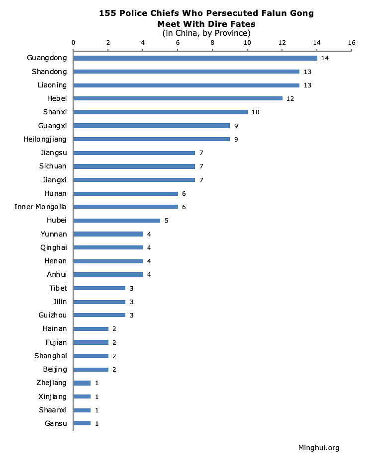 Među njima je bilo 155 direktora policijskih uprava, uključujući pokrajinske i niže nivoe. Od toga je za 84 slučaja izvijestio Minghui.org, dok su za preostalih 71 izvijestili mediji u Kini koji su pod kontrolom KPK.